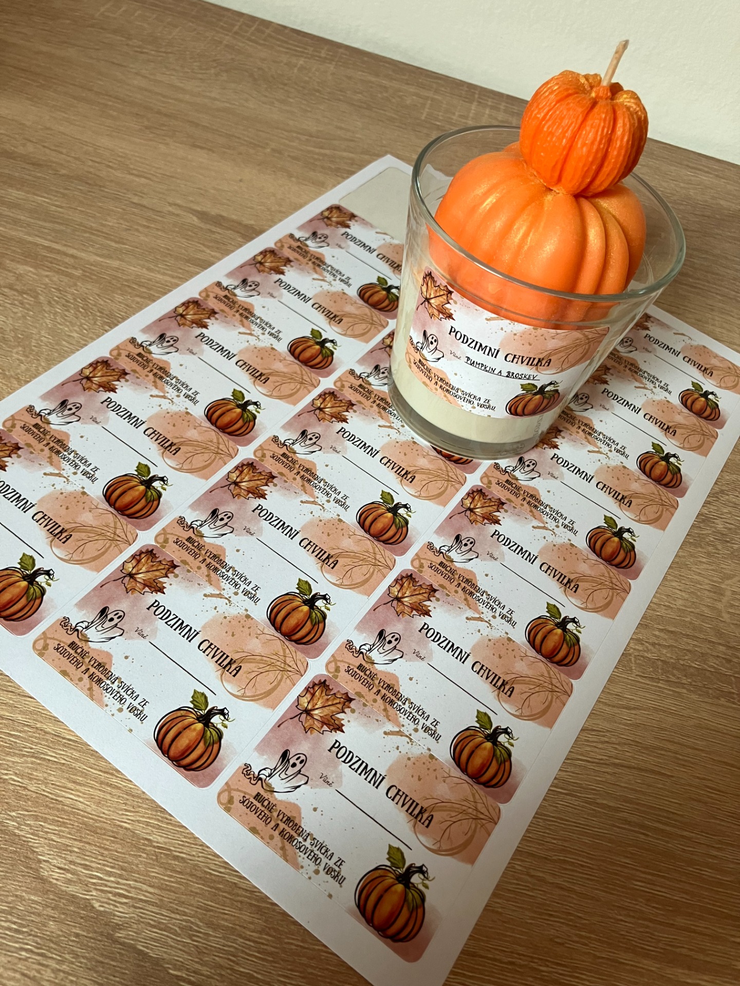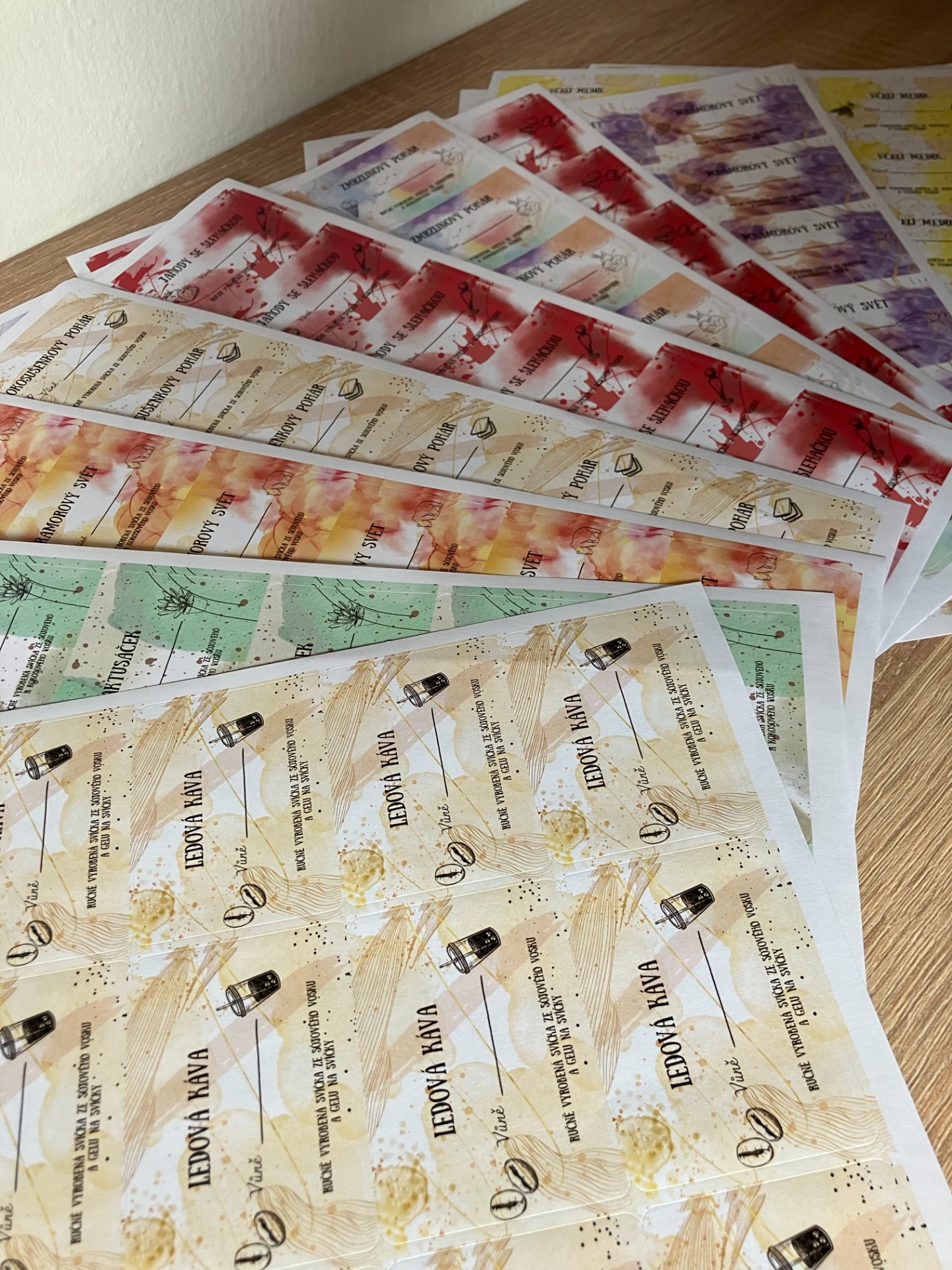 Barevně se snažím je ladit ke každé svíčce, aby to bylo hezké a sladěné jako celek. Na etiketu, zatím vždy vůni píši svou rukou, protože je i možnost vůni změnit a pro mě jednoduší, že to mohu jen přepsat.